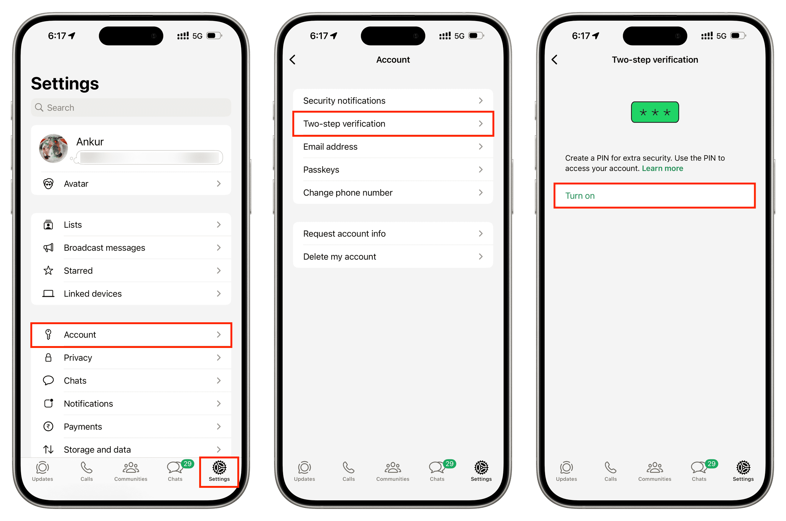 Cuando alguien con acceso a tu teléfono intenta iniciar sesión en WhatsApp desde un nuevo dispositivo, se envía un código de un solo uso al número de teléfono registrado por SMS o llamada telefónica. Puedes agregar una capa adicional de protección activando la verificación en dos pasos. Esto significa que incluso si alguien tiene tu teléfono o tarjeta SIM, necesitará ingresar el código 2FA que tú conoces para completar el registro en un nuevo dispositivo.