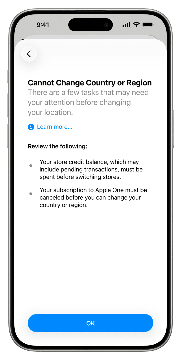 The process of changing your App Store country or region is straightforward, but you must not have any remaining balance in your Apple Account, have canceled subscriptions that do not allow country changes, and meet a few other requirements.