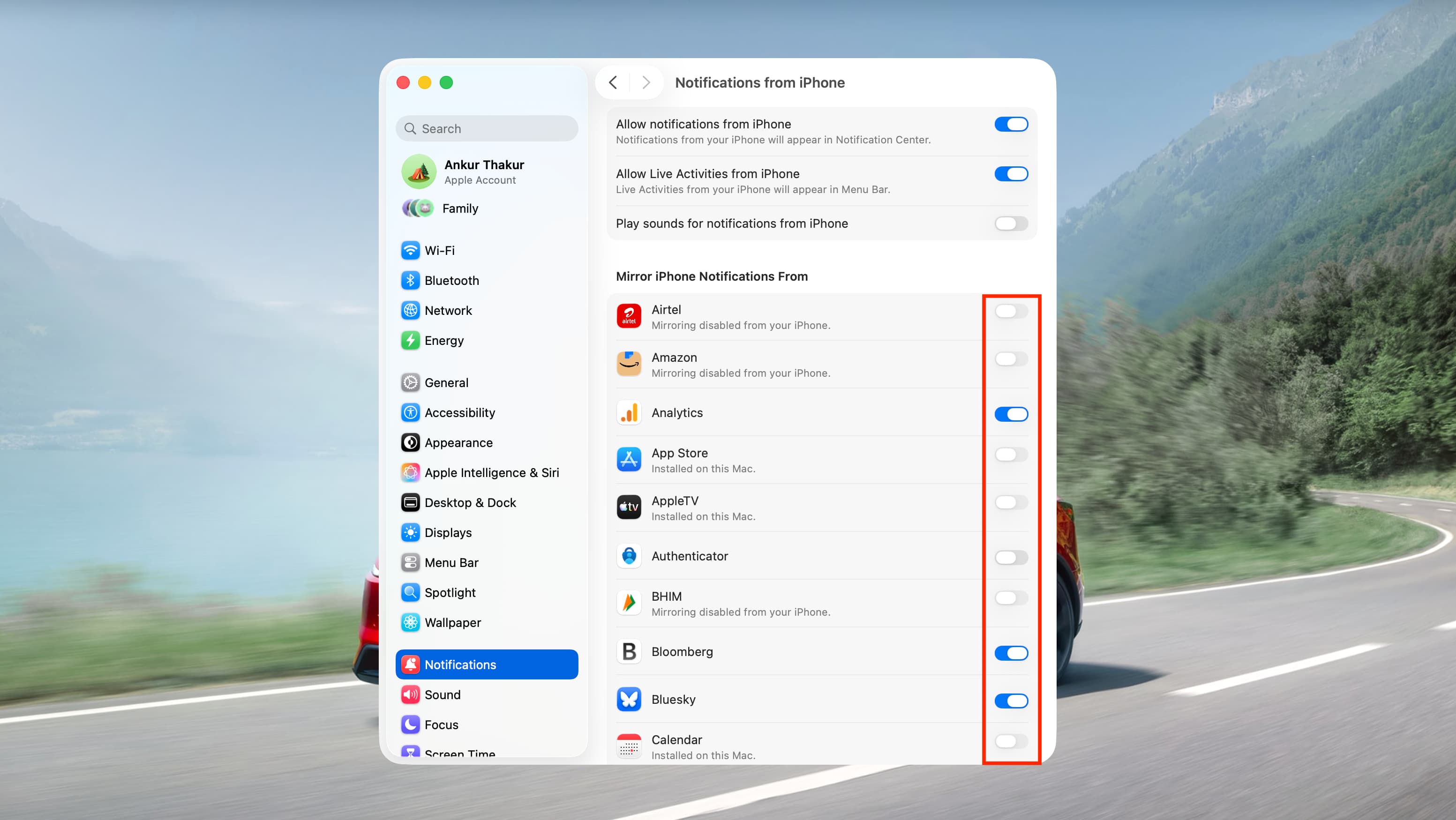 - Examinez la liste des applications iOS dans la section ‘Réfléchir aux notifications de l'iPhone’ et désactivez le commutateur pour les applications que vous ne souhaitez pas voir sur votre Mac.
