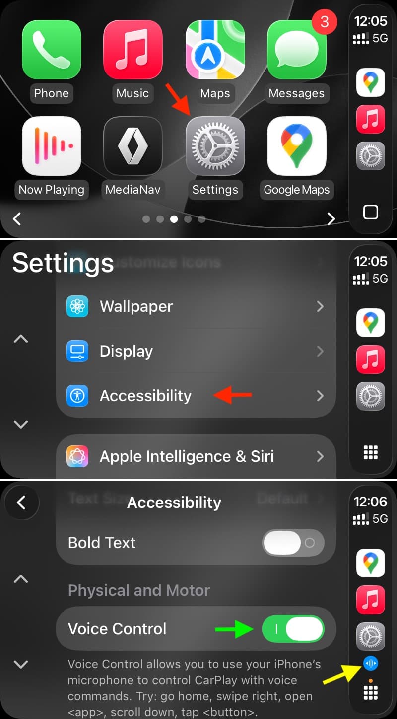 - Faites défiler vers le bas dans la section Physique et moteur et activez le Contrôle vocal. Lorsque le contrôle vocal est actif et écoute des commandes vocales, vous verrez en permanence son icône bleue dans le Dock/menue latéral de CarPlay.