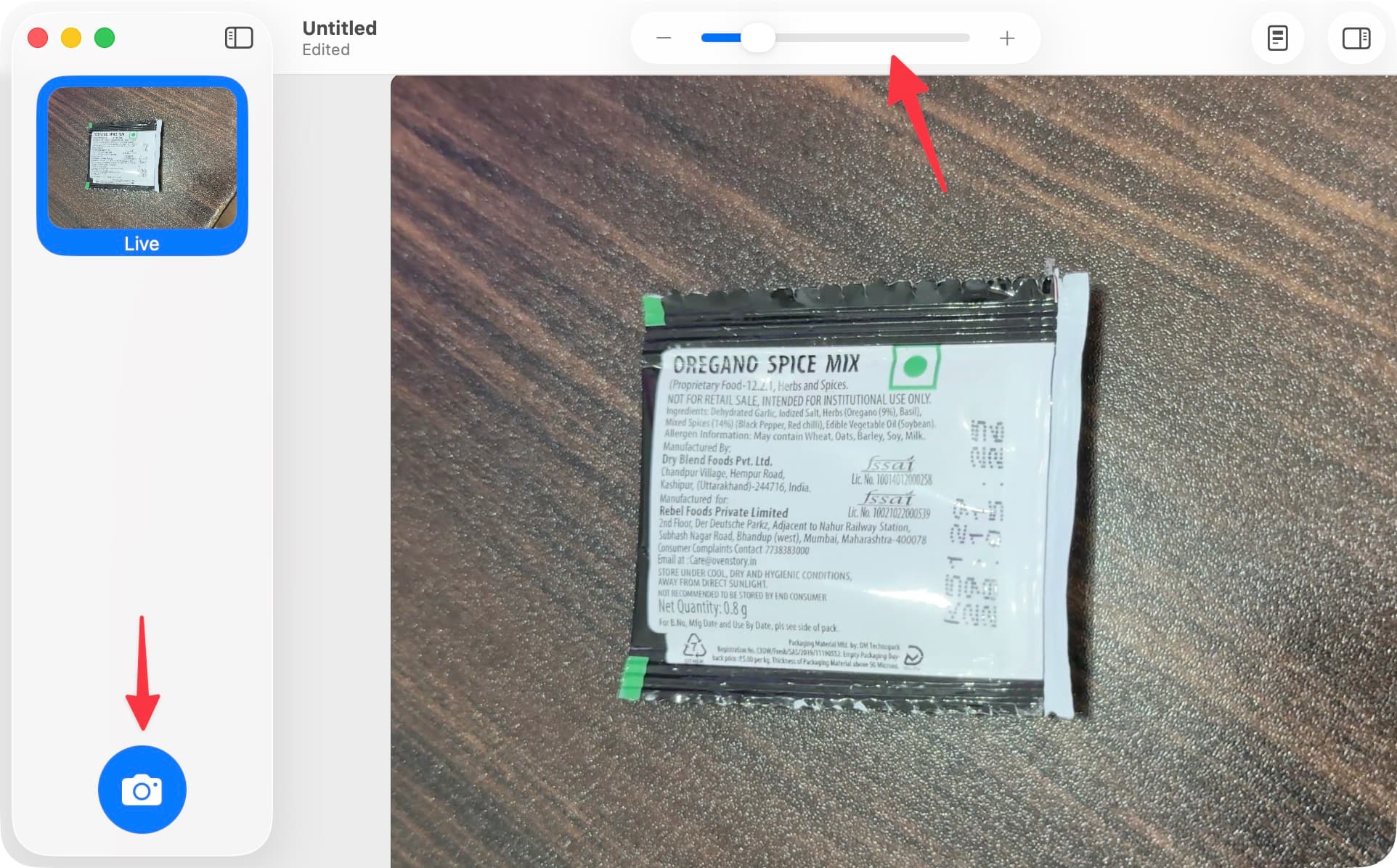 4) Utilisez le glisseur plus-moins en haut pour zoomer sur le flux de la caméra en direct ou sur la photo que vous avez prise. Après avoir zoomé sur votre flux de caméra en direct ou votre photo, faites glisser avec trois doigts pour vous concentrer uniquement sur la section spécifique que vous souhaitez.