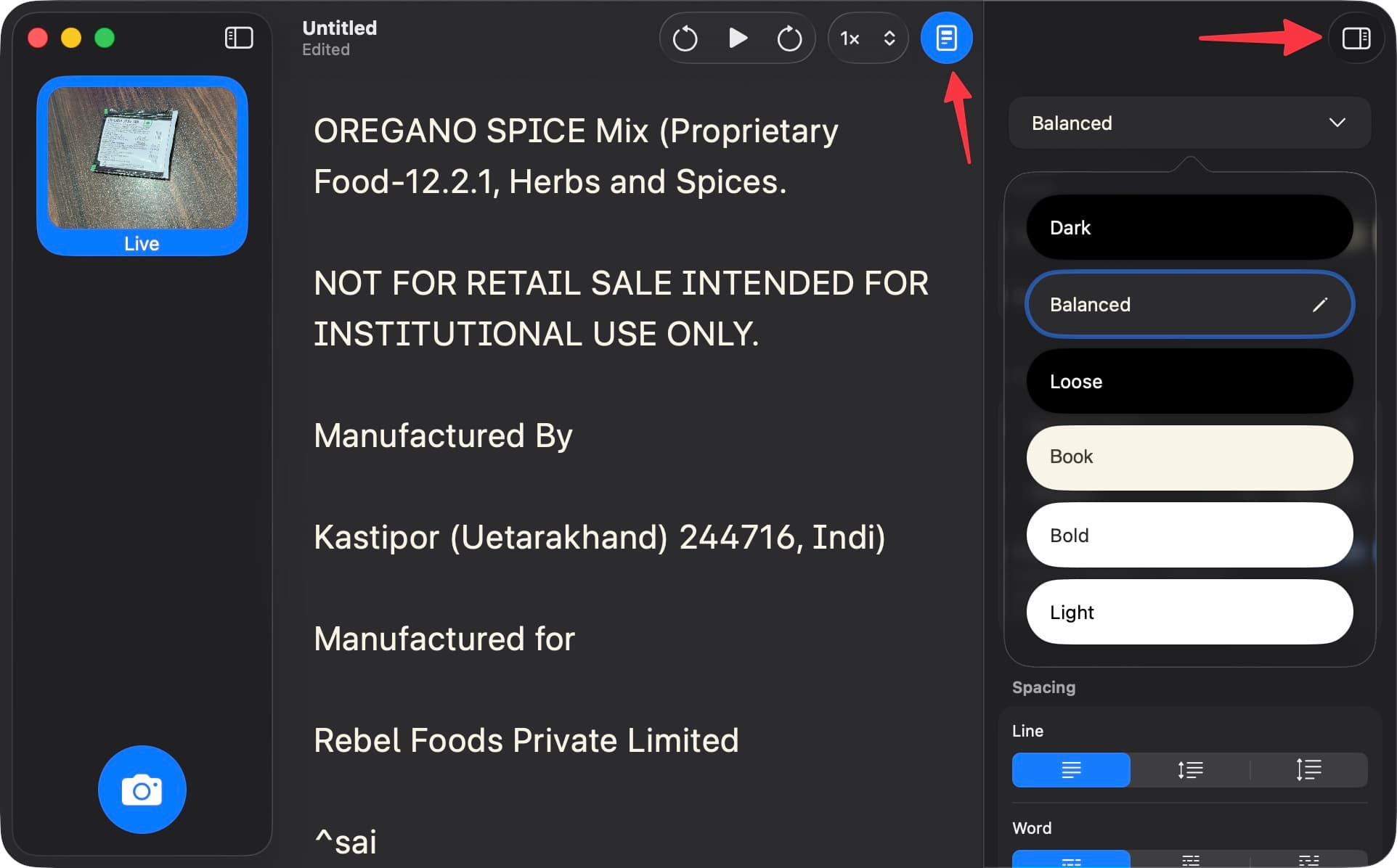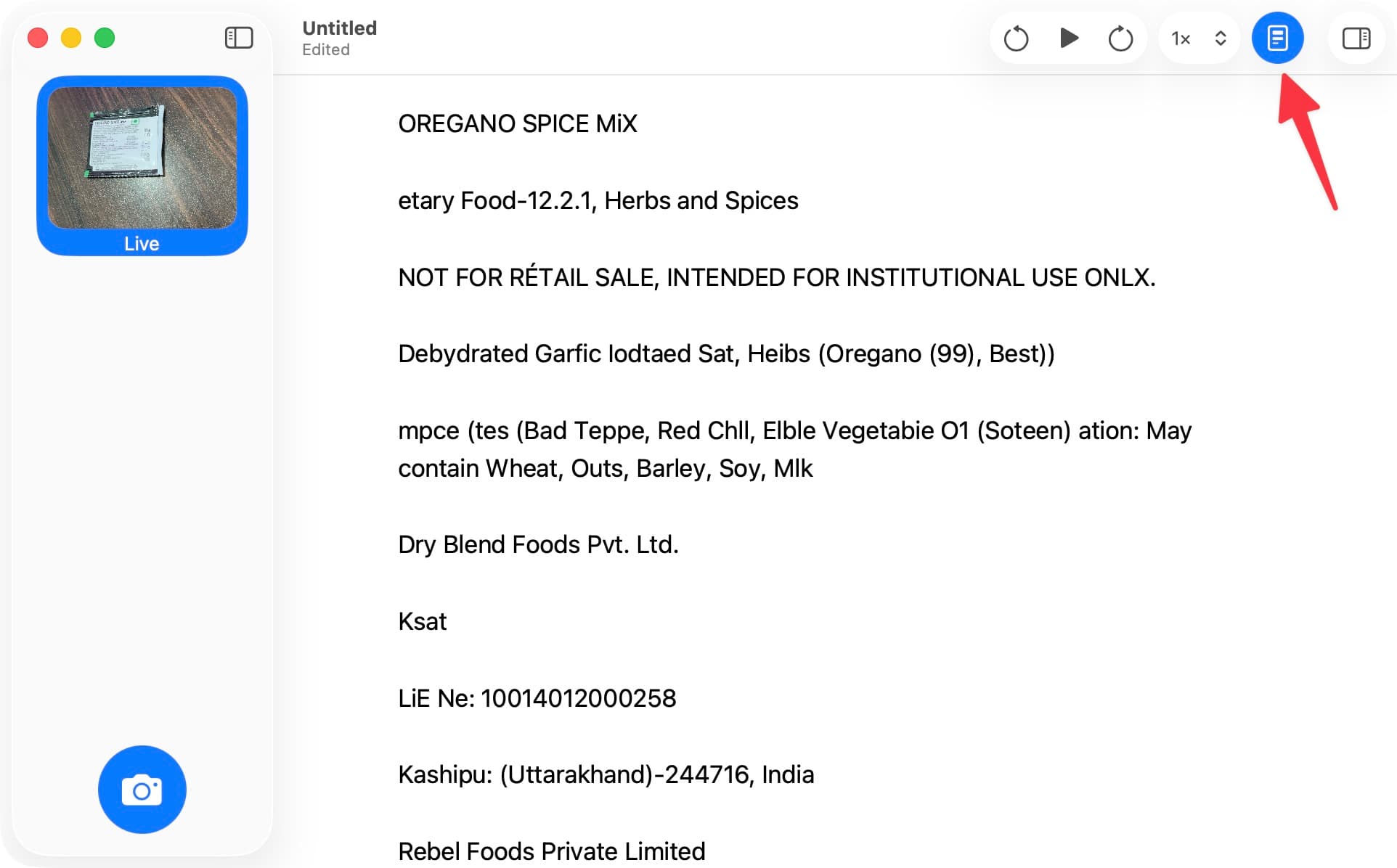 - Pour voir le texte dans le flux de la caméra en direct ou sur une photo, utilisez l'icône afficher le texte détecté.