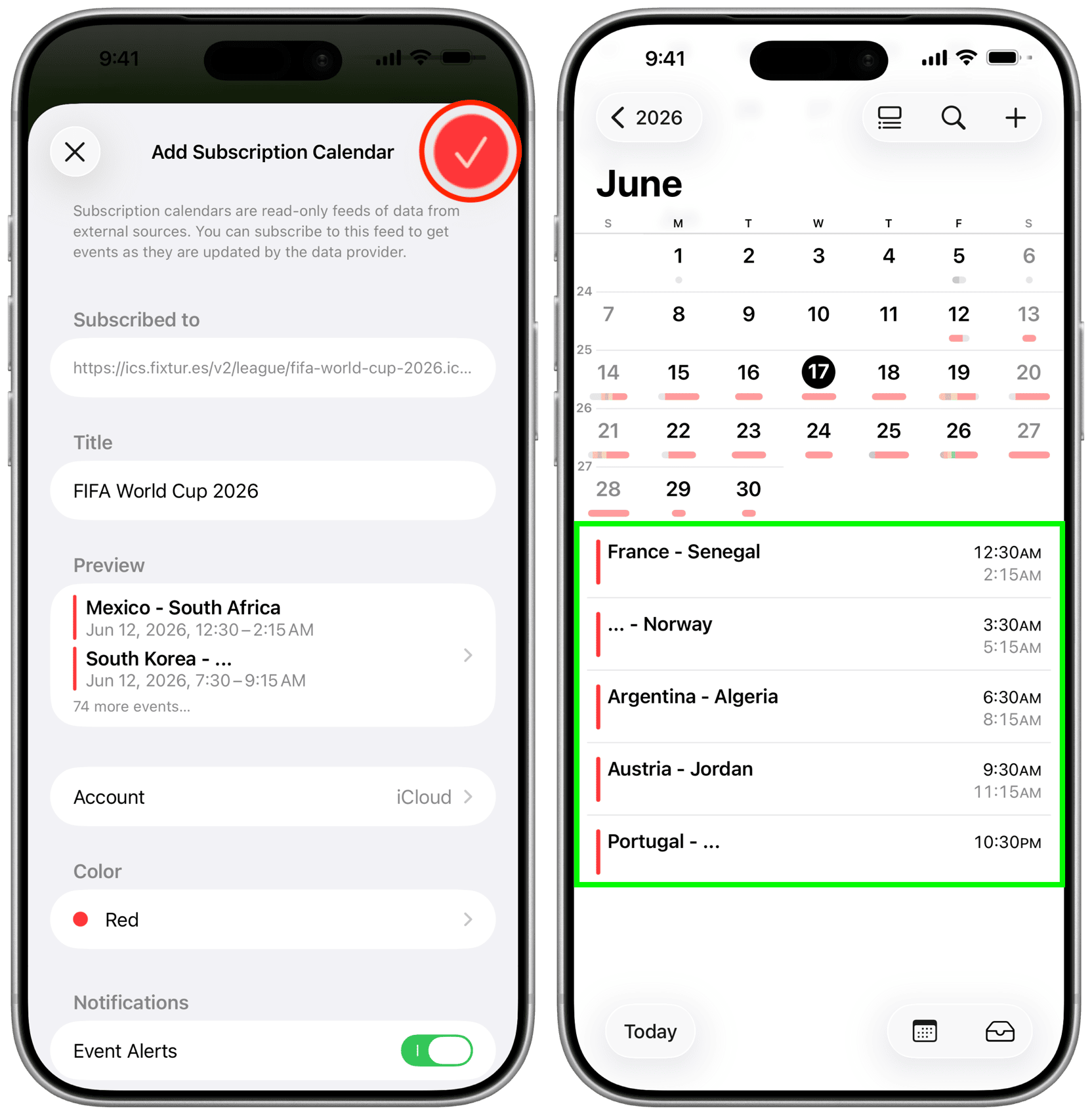 4) You will now see the Add Subscription Calendar page. Preview the events, select a calendar account (e.g., iCloud), choose a calendar color, and decide whether to receive notifications for game events. When everything is ready, tap the checkmark icon to subscribe to the FIFA 2026 World Cup calendar and see it in your calendar.