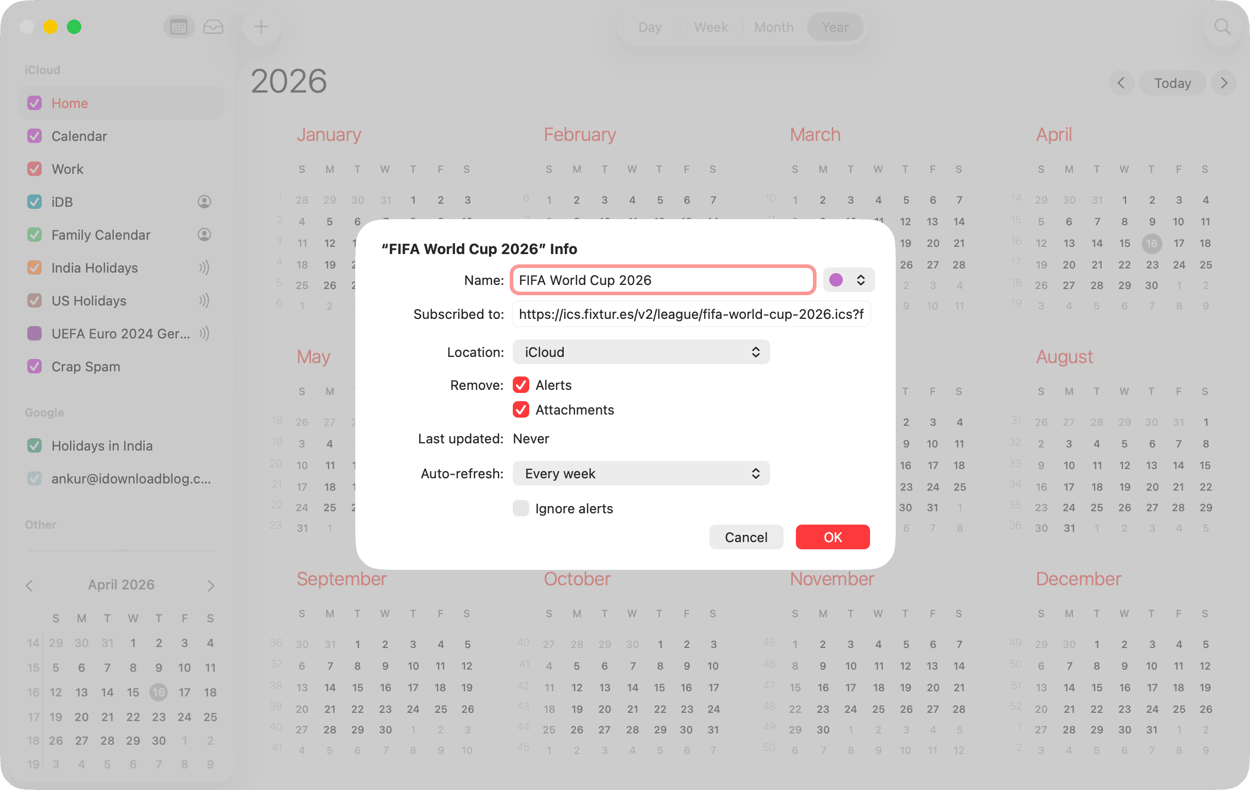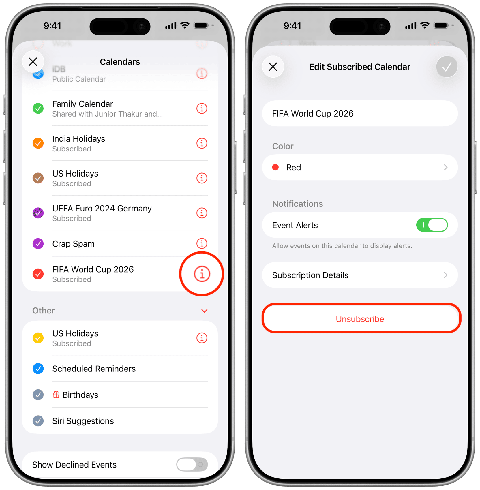 When the World Cup is over, go back to your calendars list, tap the information button ⓘ next to the 2026 calendar, and then tap on the Unsubscribe option. On Mac, click on the FIFA calendar you subscribed to while holding down the Control key and select the Unsubscribe option.