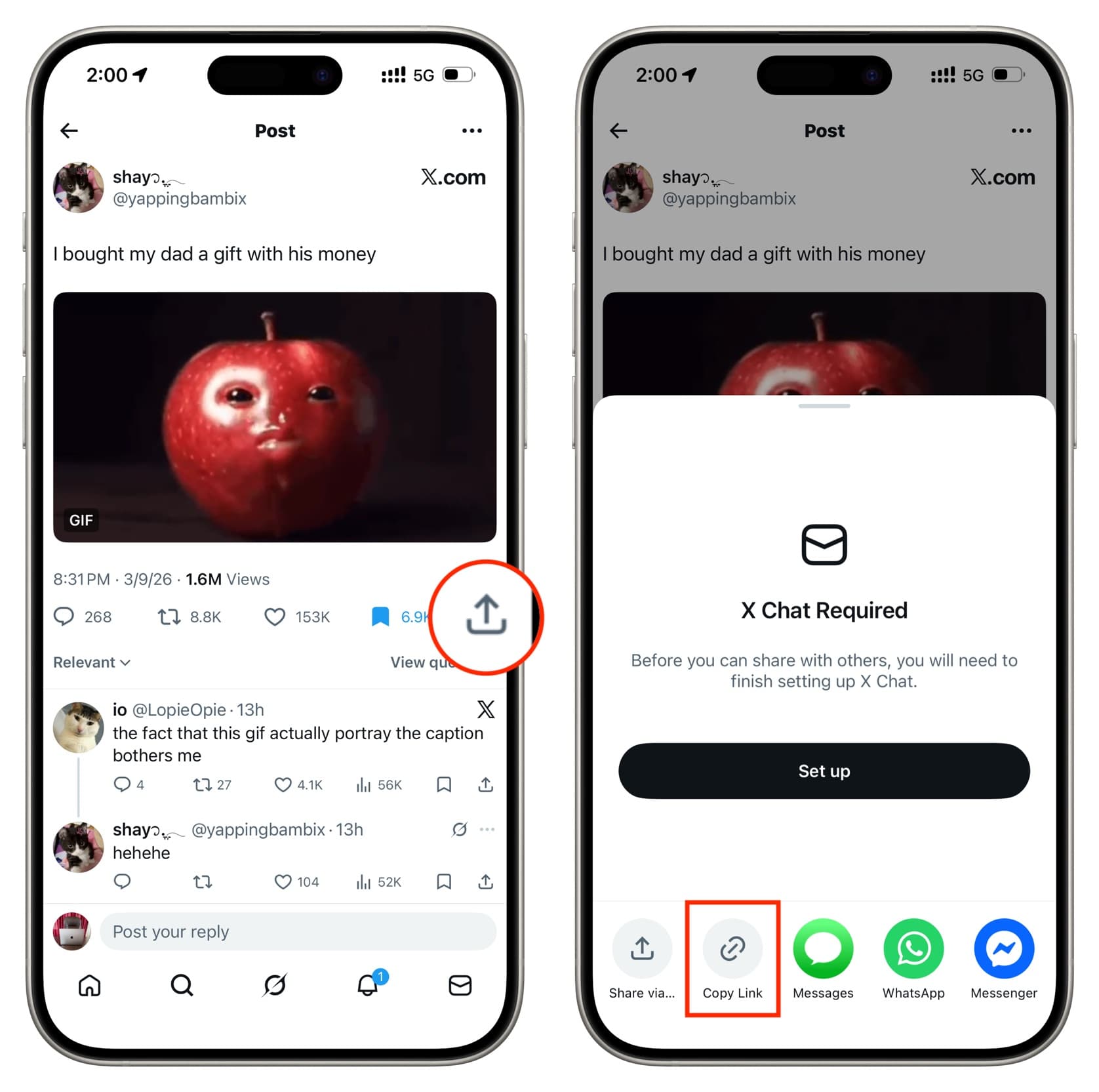 3) Tap the share button located under the X post and select Copy Link.