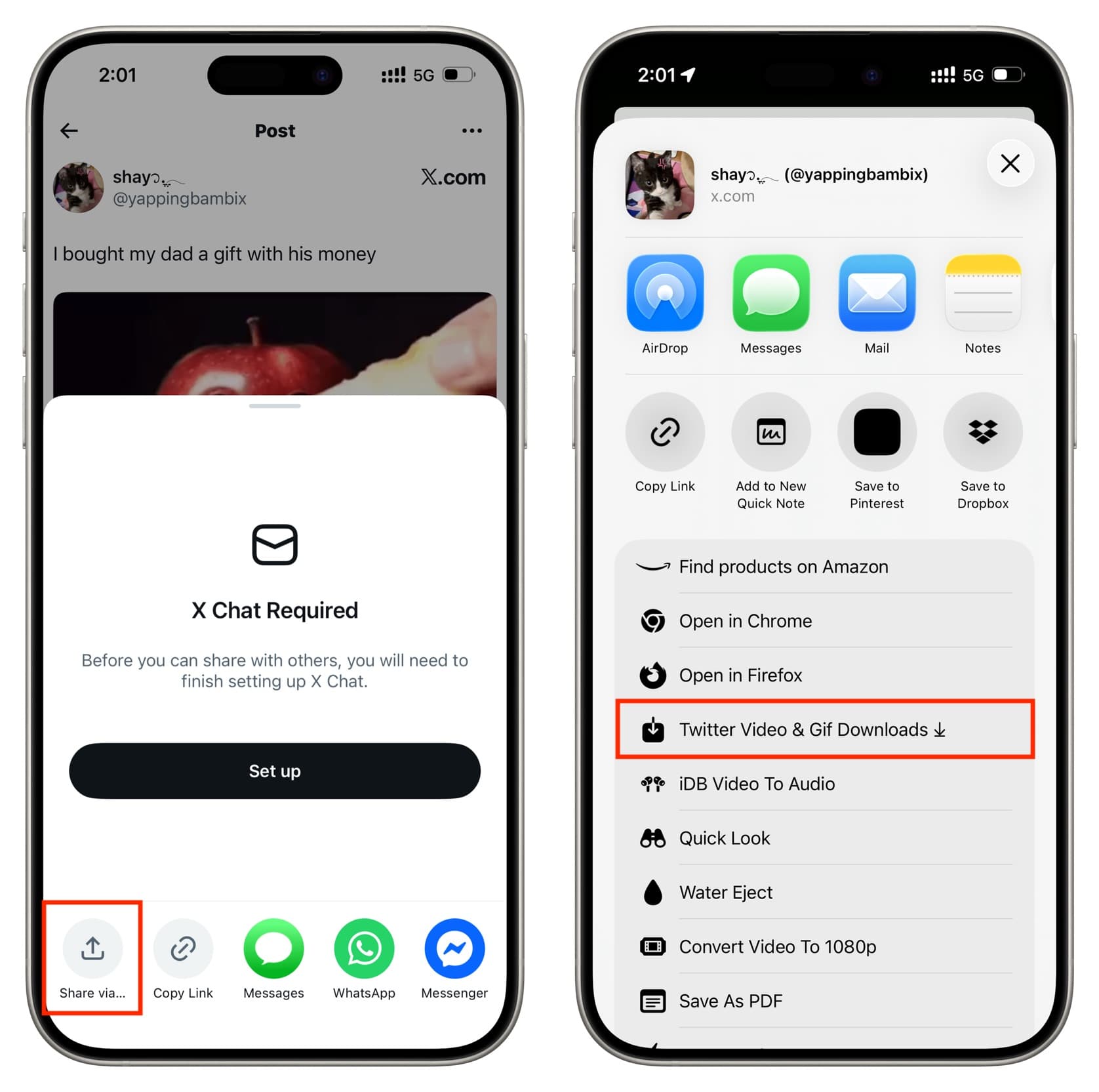 4) Tap the same share button again and this time select Share via to open the iOS Share Sheet. From there, tap on Twitter Video & Gif Downloads.