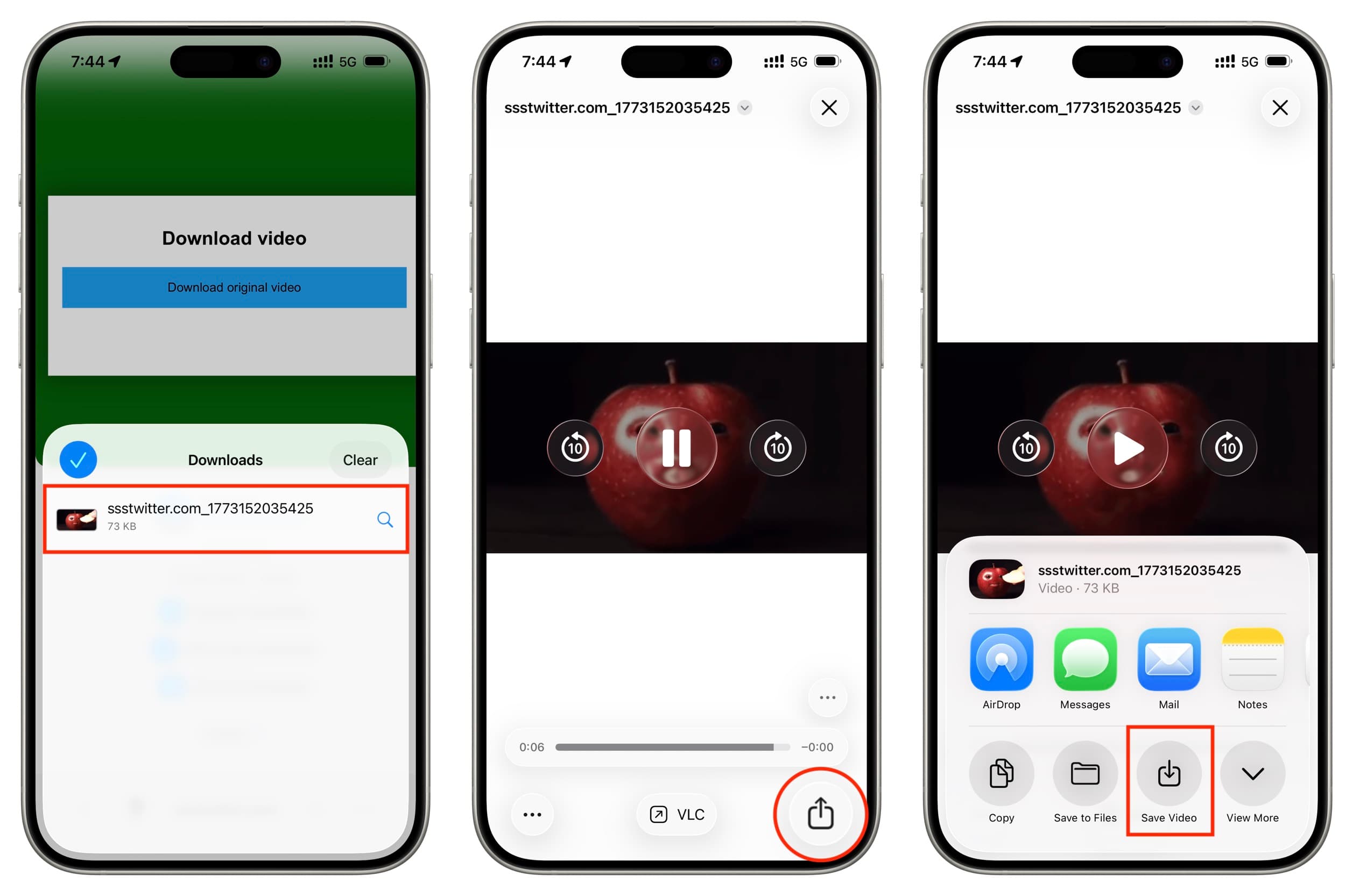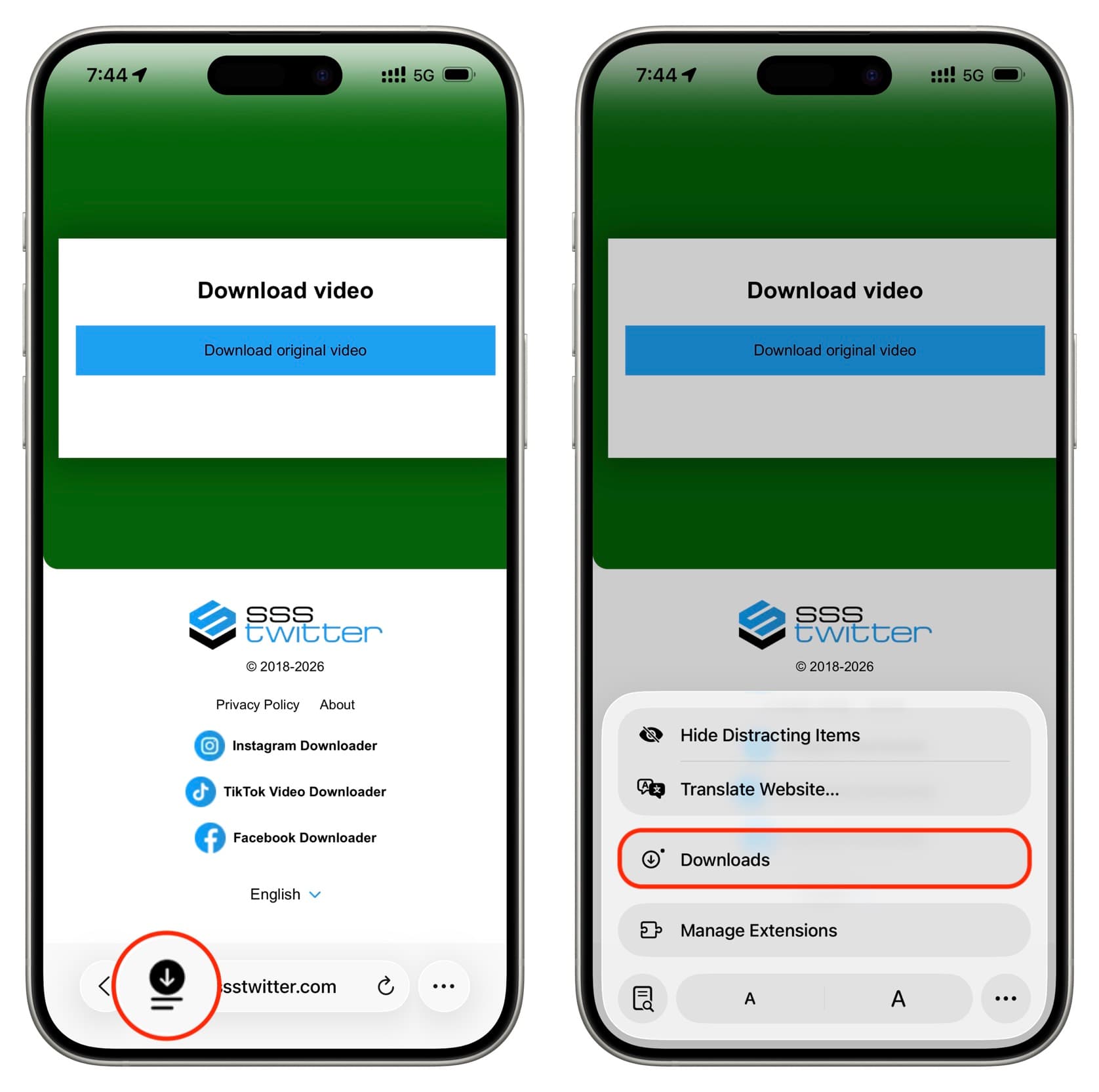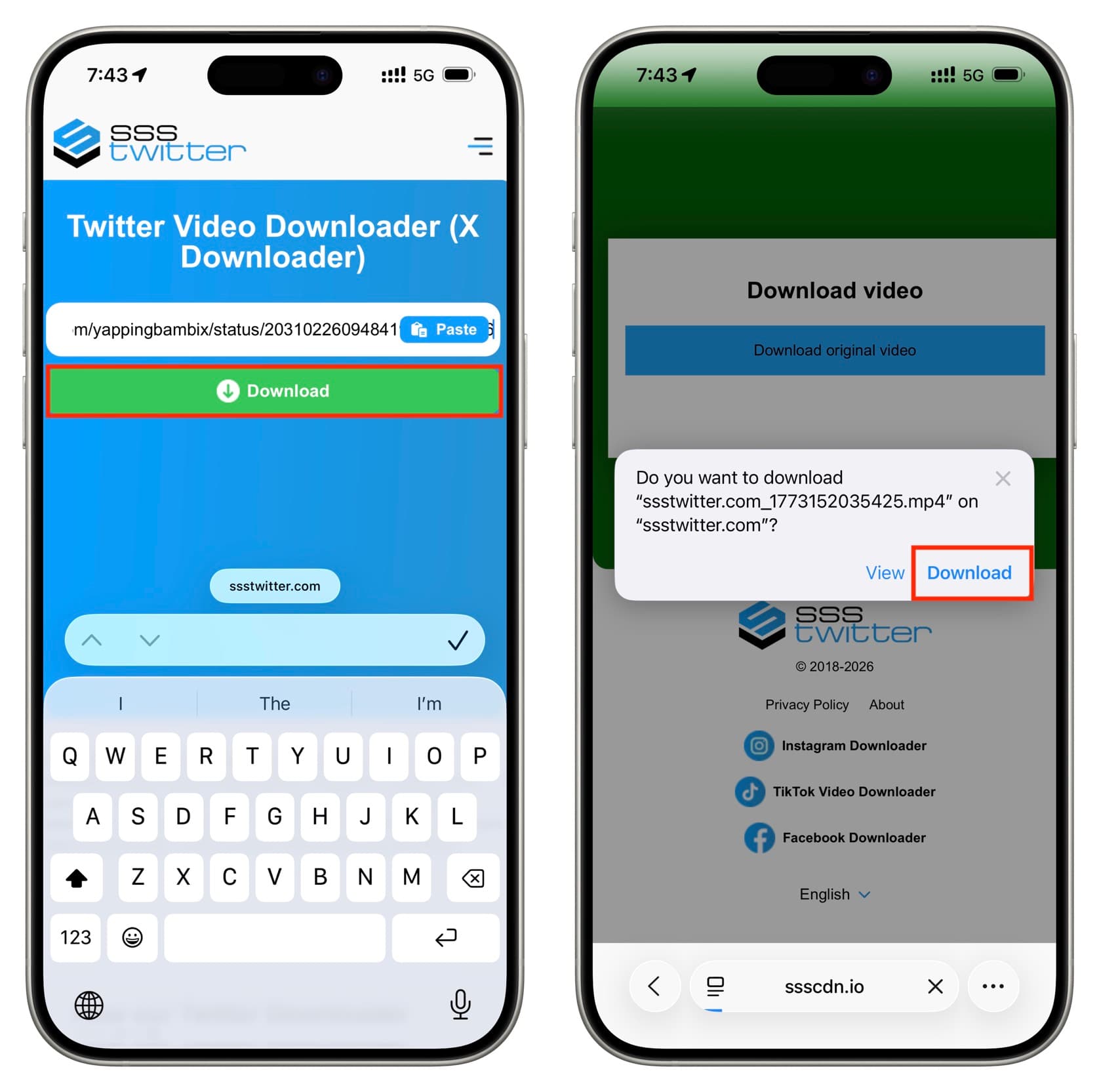 1) Copy the X post link that contains the GIF, go to ssstwitter.com in Safari on your iPhone, paste the link there, and tap Download > Download Original Video. After closing the ads, in the Safari pop-up asking what to do with the GIF, tap Download (not View).