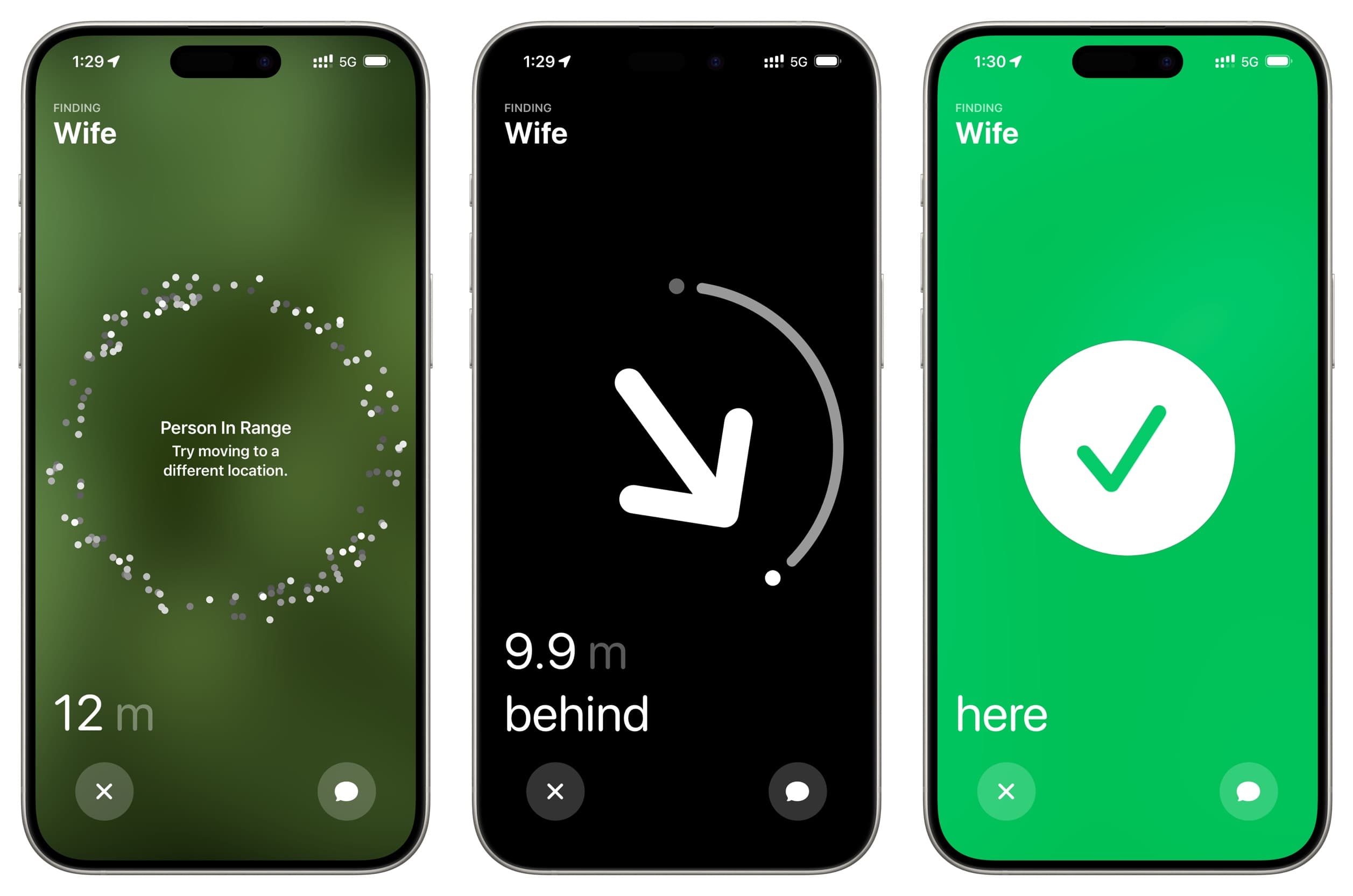 Proprio come con gli AirTag, quando utilizzi la Precision Finding per trovare i tuoi amici e familiari, ti mostra quanto distano e in quale direzione devi muoverti per raggiungerli.