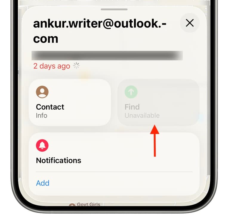 Tuttavia, se il pulsante Trova diventa grigio e dice ‘Non disponibile’, significa che la persona è vicina ma il suo iPhone non supporta la Precision Finding. Questo significa che hanno un iPhone 14, 13, 12 o 11 (tutti dotati di chip U1).