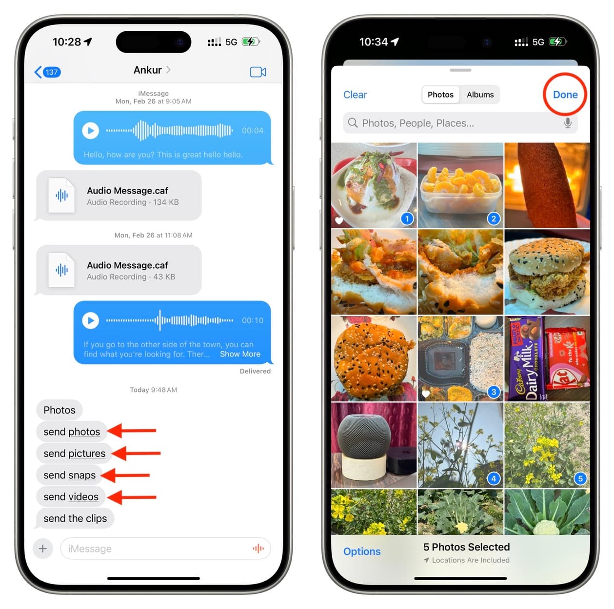 Tout d'abord, vous pouvez envoyer des images et des vidéos via iMessage, MMS et RCS sans quitter l'application Messages. Il vous suffit de toucher le bouton plus et ensuite de sélectionner Photos. En bas de l'écran, un petit sélecteur apparaît, montrant vos derniers éléments de votre bibliothèque de photos. Vous pouvez ensuite sélectionner un ou plusieurs éléments et les envoyer.