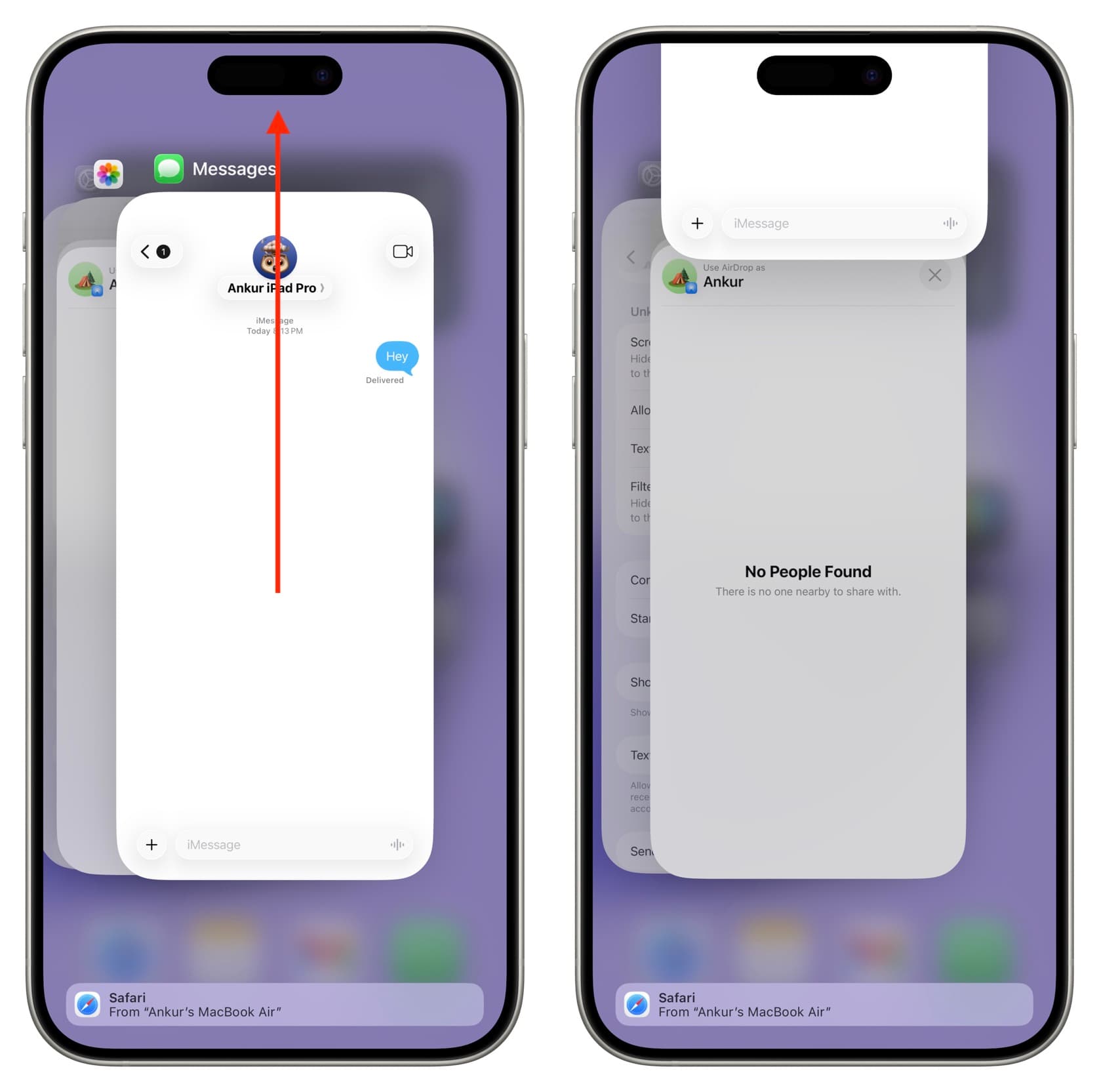 Faites glisser vers le haut depuis le bas de l'écran et maintenez jusqu'à ce qu'une série de cartes d'application apparaisse. Maintenant, faites glisser les cartes Messages et Photos (si elles sont visibles) vers le haut pour les fermer de force. Ensuite, rouvrez l'application Messages et essayez d'accéder au sélecteur de photos. Cela devrait fonctionner.