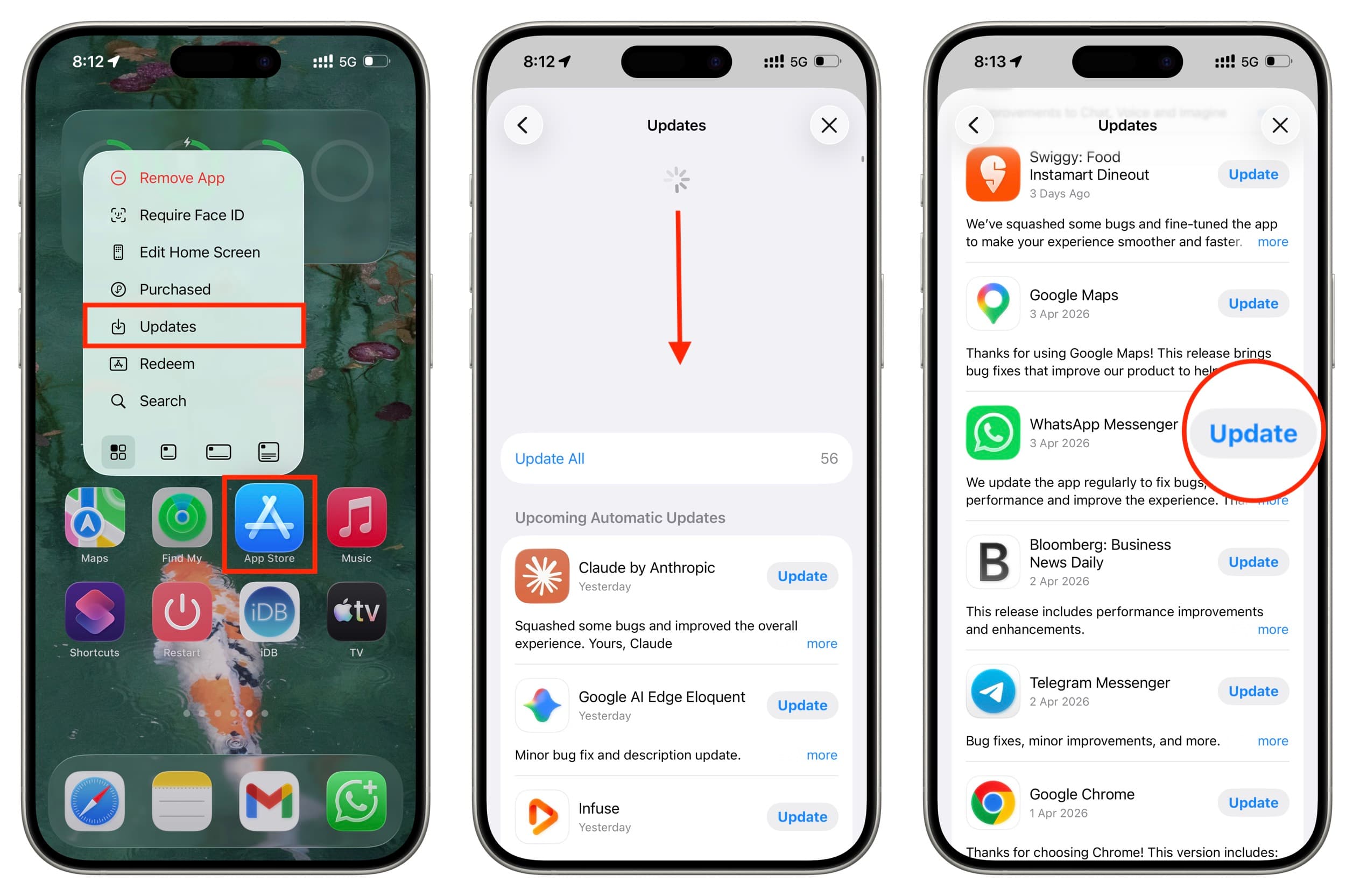 - Return to the App Store Updates screen and pull down the App Store Updates page once more to check if there is another pending update for WhatsApp. If there is, tap Update.